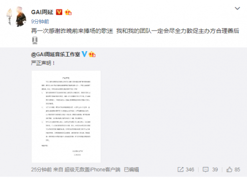 GAI周延迟到半小时只唱6首歌?工作室回应:商业浏览:21次