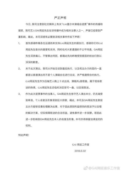 近日,GAI周延日前在墨尔本开唱,有网友爆料称GAI“迟到半小时且只唱6首歌”。2日,GAI周延音乐工作室发声明称,与主办方一直以普通演出而非个人演唱进行洽谈,现场共演唱5首歌曲,临时决定安可一曲。GAI本人也转发声明称会尽全力敦促主办方合理善后 。稍早,主办方已发声明解释,并为宣传内容疏忽道歉。
