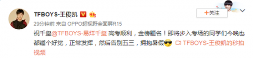 6月6日,王俊凯更新微博,为即将参加高考的好友易烊千玺以及广大学子送上自己的祝福:“祝千玺高考顺利,金榜题名!即将步入考场的同学们今晚也都睡个好觉,正常发挥,然后告别五三,拥抱暑假!”而之前也曾有网友爆料,千玺半夜去学校,在黑板上给同学们留了一句话:“大家加油!很高兴能跟你们一个班。” 延伸阅读:
