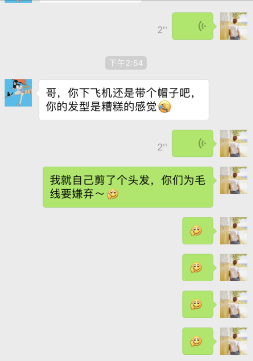 6月7日,马天宇在自己微博上传一个聊天截图,并配文称:“就自己剪了一个头发,遭各种嫌弃。”聊天记录中,马天宇的助理说:“哥,你下飞机还是带个帽子吧,你的发型是糟糕的感觉。”马天宇回复道:“我就自己剪了个头发,你们为毛线要嫌弃?”语气搞笑,十分幽默。